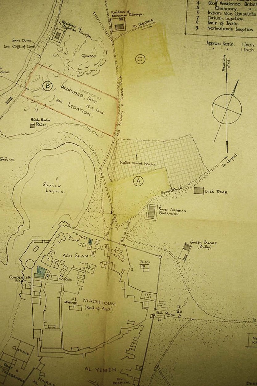 The first British minister to the new Kingdom of Saudi Arabia at Jedda was appointed in 1930. His legation leased three rundown buildings in the Ash-Shan quarter, north-east of the old town, for which the Ministry of Works took over responsibility in 1935. In the late 1930s, the sheikhs were keen to rebuild the town to the north and the opportunity arose to build a new legation. Since foreigners were not permitted to own property, a lessor scheme was devised under which the sheikhs would build and lease the buildings, but no plans materialised before the Second World War. After it, a desert site next to the sea just north of Jedda was identified for a future British legation compound, and approved in 1947, but it was broken up and re-allocated to others before anything could be agreed.