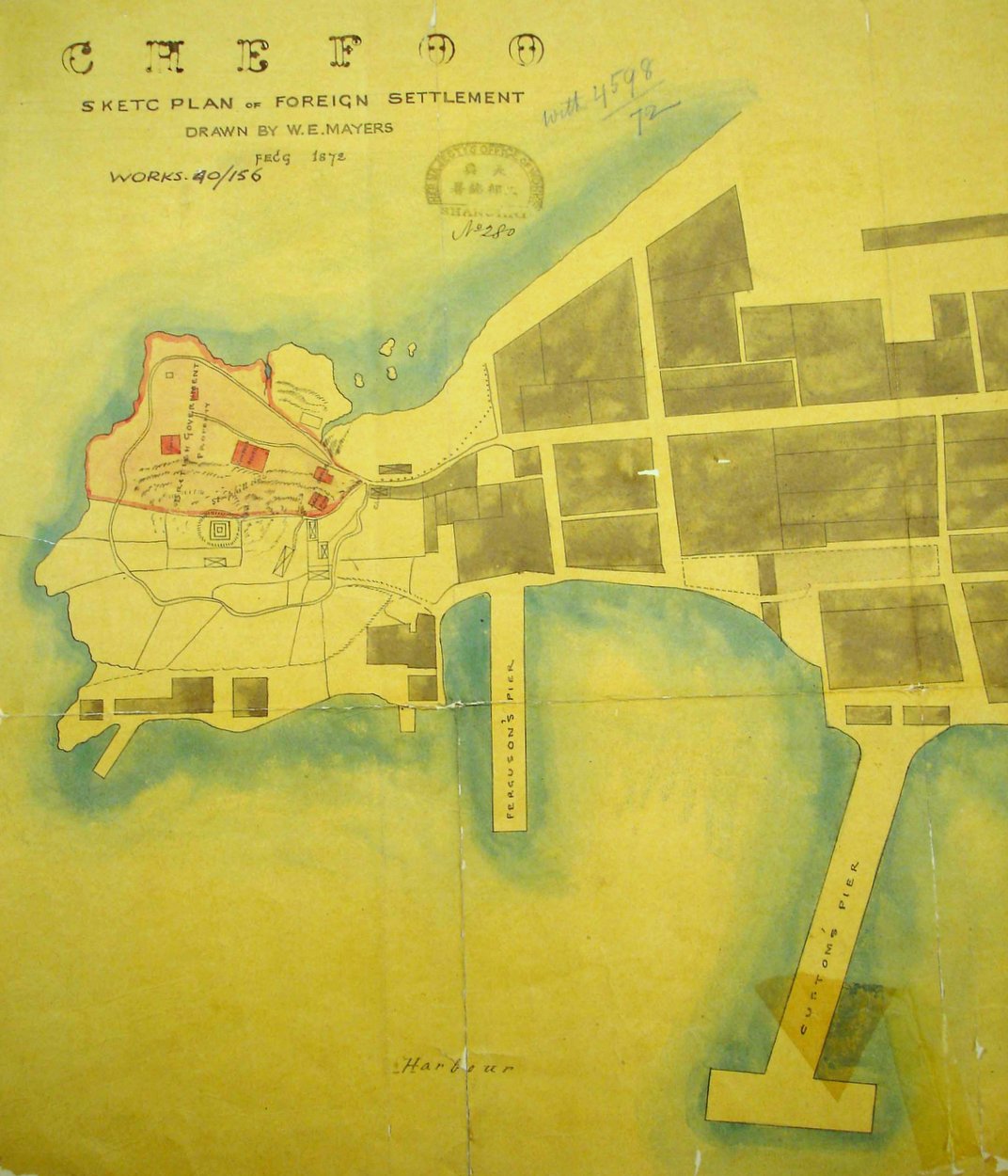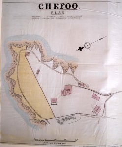 Port at northeast tip of Shantung province. Designated a treaty port by Treaty of Tientsin 1858, and later a noted summer retreat from Peking. The consulate was established in 1861. Various plots were bought from local Chinese owners during 1864-67 to create a compound, later walled around, of about eight acres in the north east corner of the headland immediately north of the old town. Residence bungalows for the consul and assistant, and offices, constable’s quarter and lock-up were built here in 1870. About a quarter of the compound at the north end was subleased in perpetuity in 1878 to a Mme Elizabeth Nicolaeva Startseff, and the holding was regularised through a new title deed in 1934. After the post was closed [when?], military forces occupied the consulate in 1947, and it was sold in 1964 to the Chinese authorities.