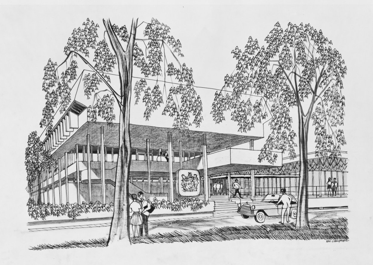 About 3,500 square metres of high commission offices, designed by Ken Campbell, an in-house architect of the Property Services Agency (a descendant of the Ministry of Works), were completed on the Tanglin site in 1973. The contractor was Albert’s Construction Co. The main building has three floors of cellular offices, arranged off two parallel corridors with ancillary functions between them. The commercial pavilion is single storey with a wide-spanning space-frame roof that enables large and flexible internal spaces and a continuous curtain wall of grey tinted glass, with a large carpark beneath. The entire exterior was clad with off-white glazed ceramic mosaic. The whole composition was light, bright, well considered in manner and detail, good to work in, and skilfully related to the topography and landscape of the site
