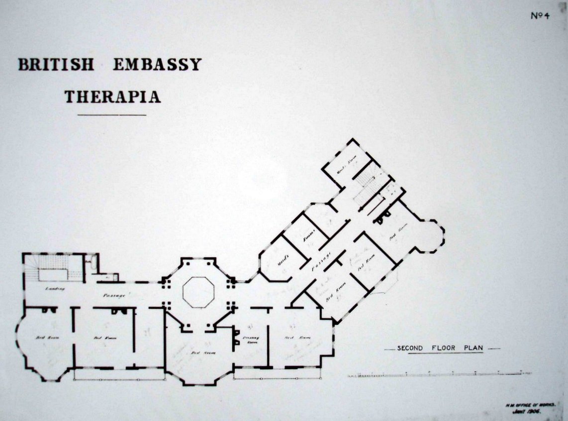 It was a fanciful Victorian mansion rising in parts to four floors, with a ground floor of vaulted brickwork supporting a timber superstructure, the facades painted grey with green shutters. The whole was attached to a hillside terrace via a grand octagonal entrance hall and bridge at first floor level. The hillside terrace was an adaptation of the former factory magazines and within their brick barrel vaults, two of which spanned natural calciferous springs, were the stores, kitchens and offices serving the new residence. The ground floor contained the main entrance, servants quarters, and chancery at the north end with its own stair up to the ambassador’s study on the floor above. The first floor had the reception rooms served by broad corridors and the double height octagonal entrance hall with its bridge to the garden terrace. The second floor contained all the sleeping accommodation.