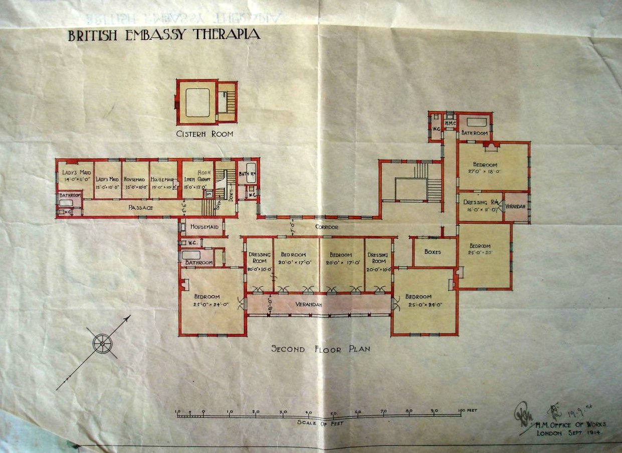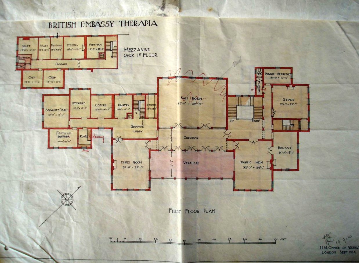 In January 1866, a Major Edward Gordon was appointed as the superintendent of British government buildings in Constantinople, reporting direct to the Treasury and not to the Office of Works. Asked for his own advice on the future of the Therapia buildings, Gordon observed that ‘In front of the Ambassador’s dwelling are the most unsightly ruins of a factory, which add greatly to the general air of desolation pervading the whole of this property …’. He concluded ‘To speak plainly and in a few words, I should say that the work most urgently required is an entire New Embassy’. He estimated that it would cost about £14,000 and he included this sum in his annual Estimates bid for 1867, strenuously supported by the newly-arrived ambassador, Henry Elliot. The Treasury agreed to proceed, and was content to leave all design aspects to Elliot, within a maximum of £10,000 and subject to approval by the Foreign Secretary and the Treasury.