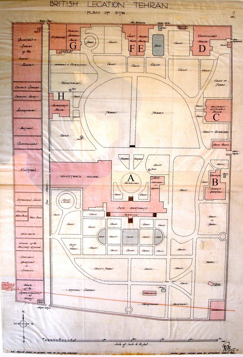 In 1931, a 10-15 metre wide strip of land along the south of the compound was ceded to the Municipality to enable street-widening. This required the house of the Works superintendent to be rebuilt (House S). Three years later, a 16 metres wide strip along the whole of the Avenue Ferdowsi frontage on the east was likewise ceded. As a result, Houses B, C and D lost their back quarters and yards; the consulate offices moved to the north end of the Mews, next to the north gate, and the consul to House F; the original gatehouse was rebuilt; and the Oriental secretary moved into the adapted House B.