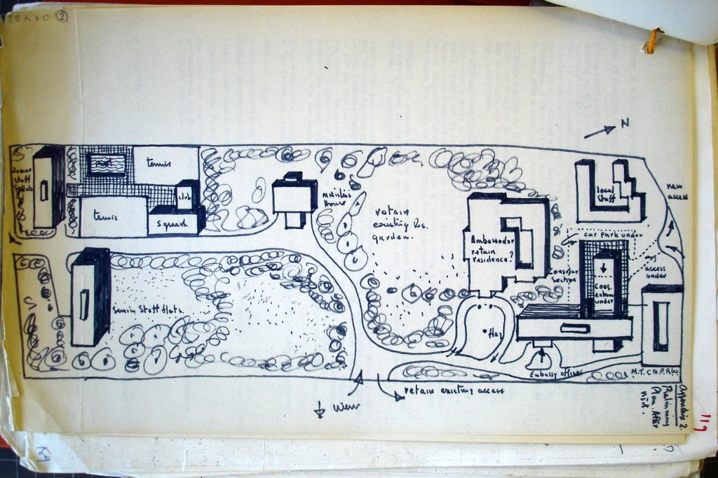 A senior Ministry architect, James Truscott, produced in 1969 a reasonable scheme for junior flats, based on ideas for partial redevelopment of the compound that had been around for some time. Treasury had agreed that 24 flats could be built for junior staff but there was no agreement on its siting. The embassy, fearing more piecemeal insertions, argued with reason that any flats project should be part of a long-term development scheme. Michael Cary, permanent secretary at the Ministry, concluded his visit to Tokyo in July 1970 by drawing up a ‘concordat’ with the ambassador. Its development intentions included: at least 12 junior UK staff flats on the Ladies’ Mess site; 16 UK staff flats on the compound near the south gate; a new Chancery building north of the ‘temporary’ office building; new Japanese staff quarters in the north-west corner; and the modernisation of all the staff houses on the compound. Were this to be carried out in full, only 28 of the 70 UK staff would need to be housed in local hirings.