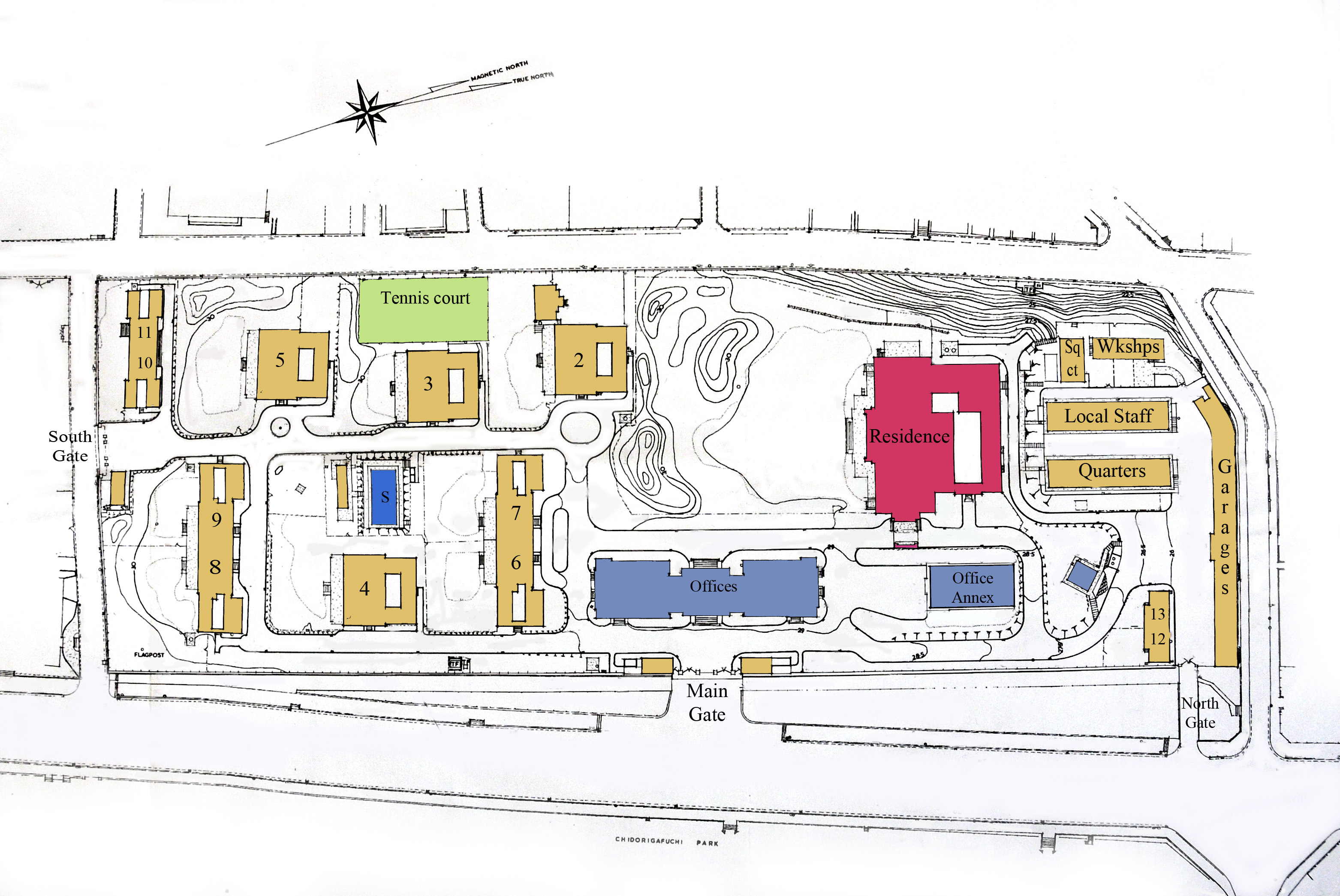The Kojimachi compound, which survived the war intact, was formally re-occupied on 16 September 1945 by the British (Military) Liaison Mission. It was not until the occupation of Japan came to an end with the signing of the Japanese Peace Treaty in April 1952 that the full range of diplomatic relations could be resumed, the embassy re-constituted, and an ambassador appointed. Whereupon, the pressure on space was greater than the compound’s buildings could meet. One of the houses was converted to offices, and some sections of the embassy moved to leased premises off-compound. A three-storey house was bought in 1952 for £13,000 at 3/2-7 Chome Roppongi in Minato-Ku and adapted to the requirements of a Female Mess (later termed Ladies’ Mess) where single female embassy staff lived together, taking meals communally. This building was later converted to individual flats, and then an embassy club, and was sold at a significant profit in the early 1970s.