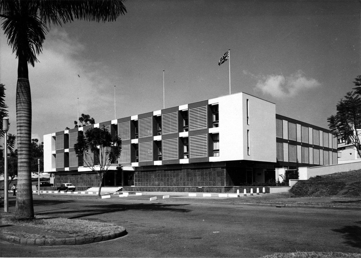 A 0.2 hectare site on which to build high commission offices was leased for 99 years from 1963 at 10-12 Obote Avenue (sometimes called Parliament Avenue). The building, square with a central courtyard, was designed by the Ministry of Works, with PA Searle the architect, and completed in 1967 [?]. It was not many years before the building proved too large and surplus space was sublet, including to the British Council and the American embassy. Following the introduction of a visa regime in 1990, space low down in the IPS building, next door at 14 Parliament Avenue, was leased and converted to visa uses.
