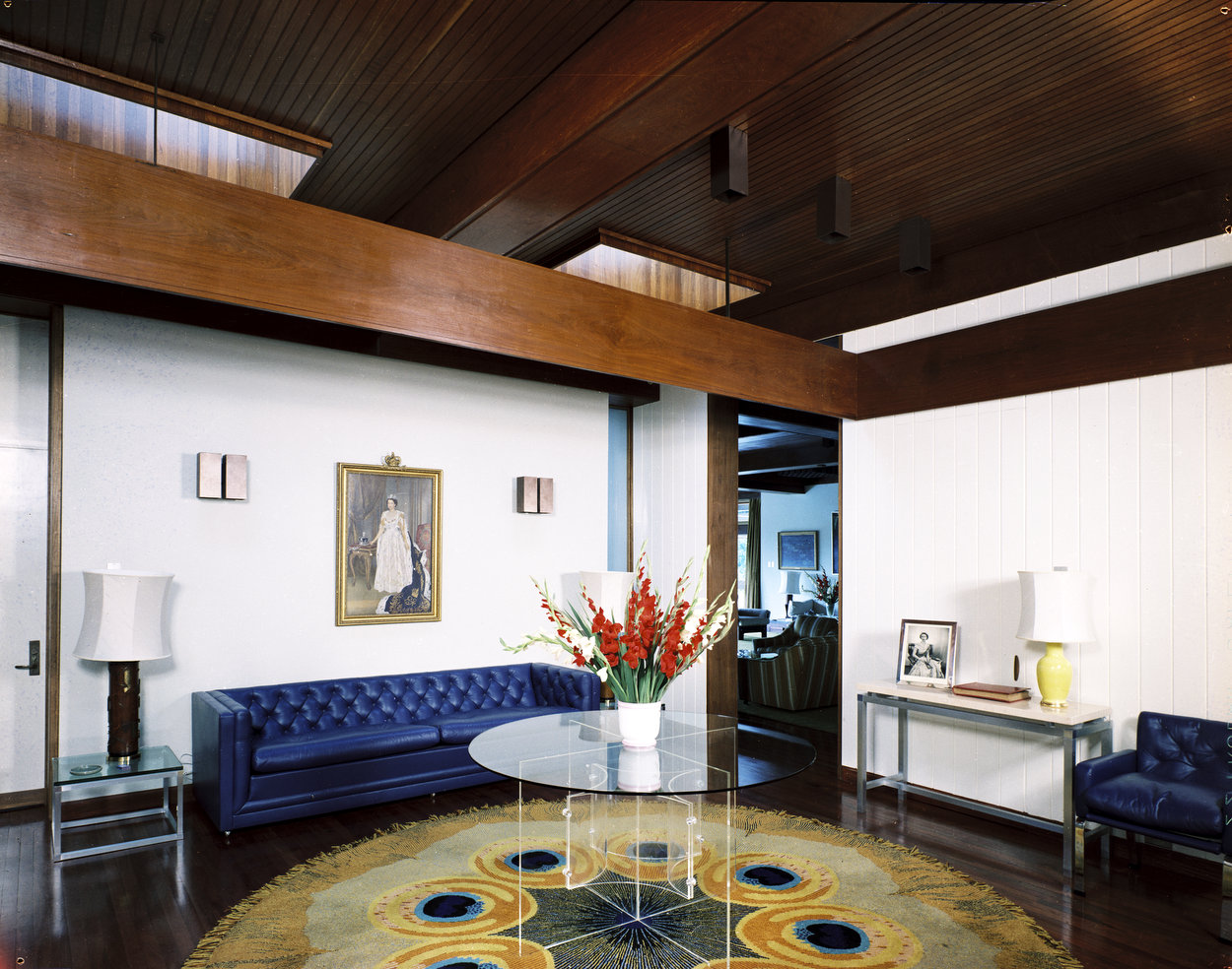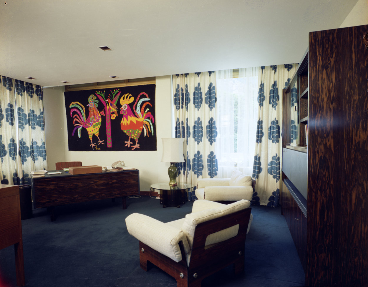 Design work for the new residence on Calle La Planta eventually began in the late 1960s, by in-house architects of the Ministry of Public Building and Works. The resulting house was occupied in 1973. It has two storeys and lies along the contour of the sloping site, with the entrance at the upper level. On that floor are the reception rooms overlooking the garden, extensive terracing and service rooms. On the lower floor, are the private suite and an array of bedrooms and ancillary spaces, all with direct access to a terrace shaded by the floor above, and to the garden.