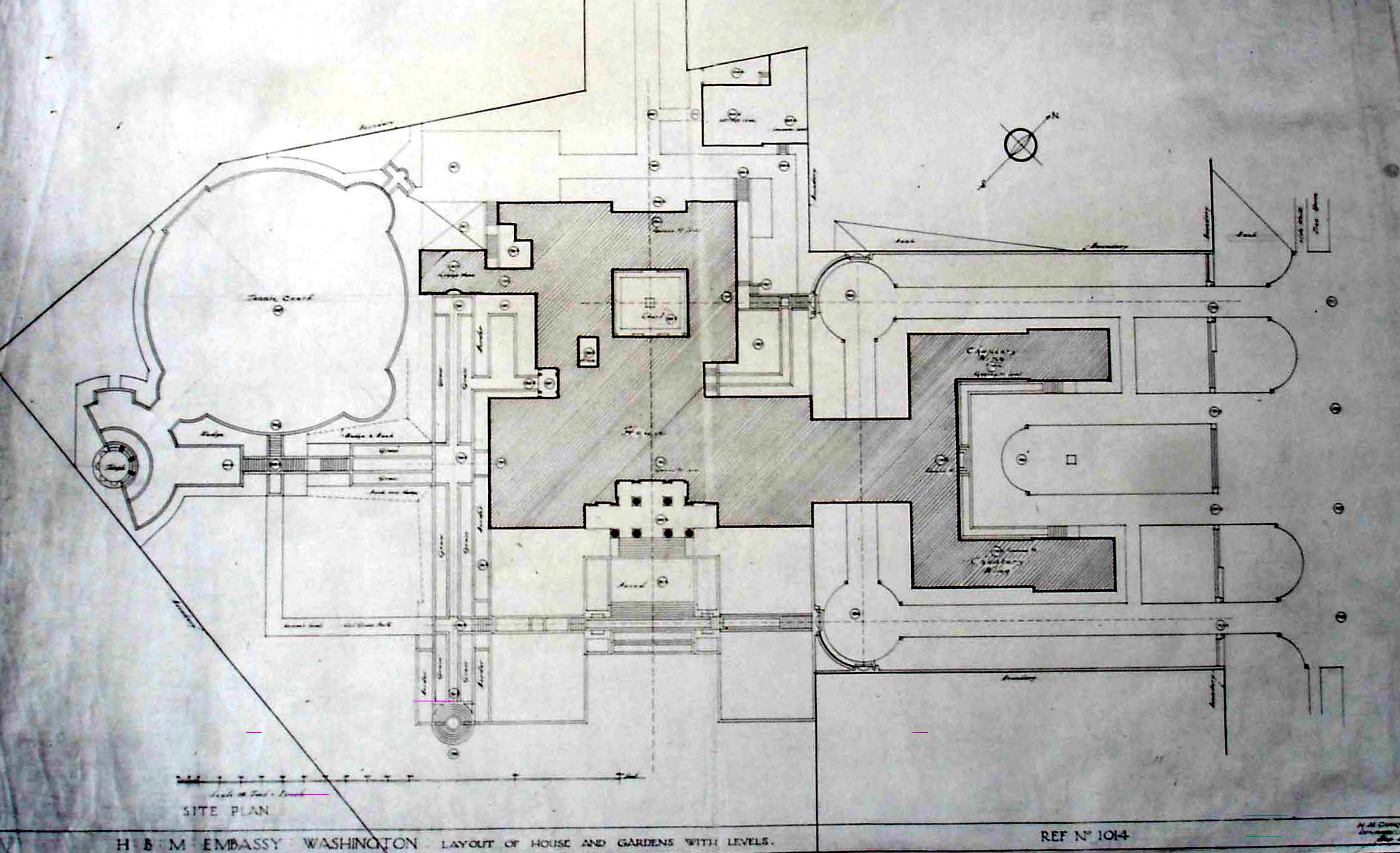 Lutyens’ layout of buildings, with residence on the left, facing south-east, and chancery on the right, facing north- east to Massachusetts Avenue.