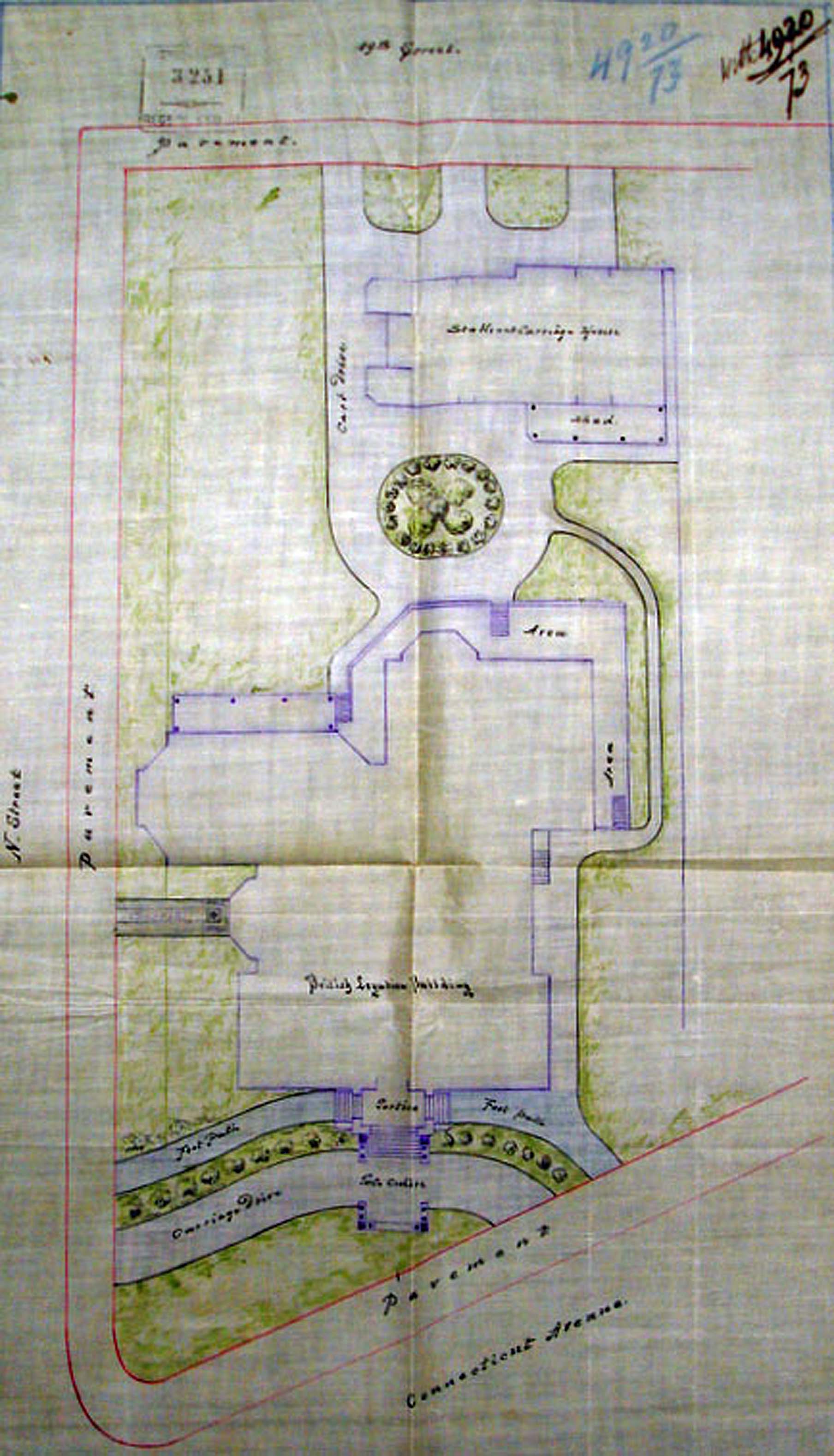 Part of Baist’s 1931 real estate map of Washington showing Lot 40 acquired for the new embassy buildings, with Lutyens’ subsequent buildings overlaid in pink.
